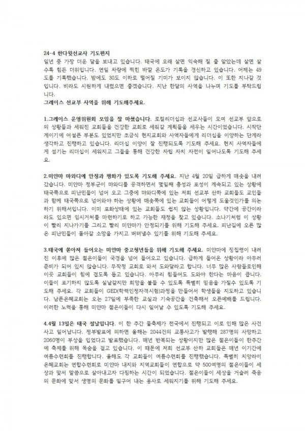 미얀마 한다윗 선교사 기도편지(24년 4월)