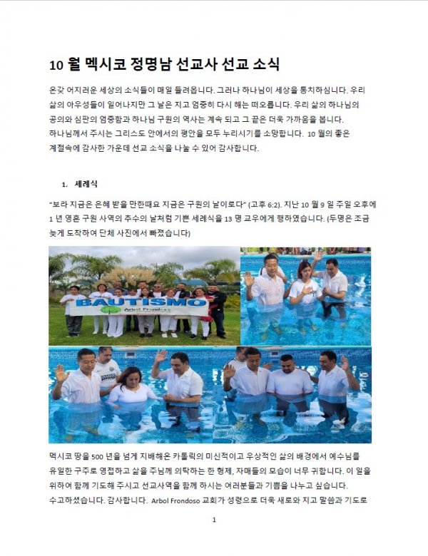 멕시코 정명남 선교사님 선교편지(10월)