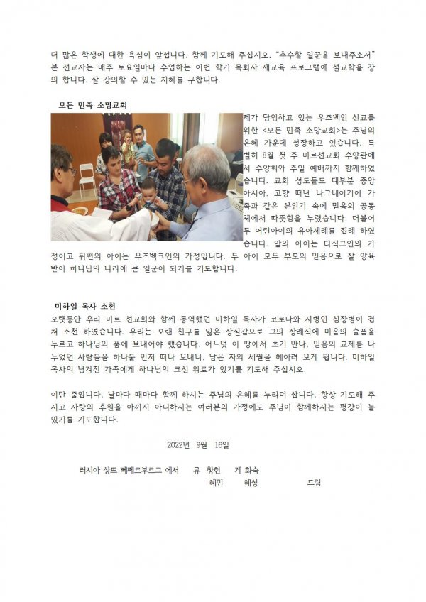 러시아 류창현, 계화숙 선교사님 선교편지(9월)