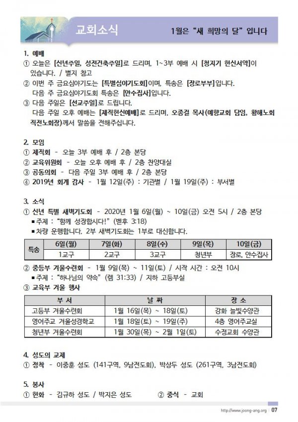 1월 5일(주) 교회/교우 소식
